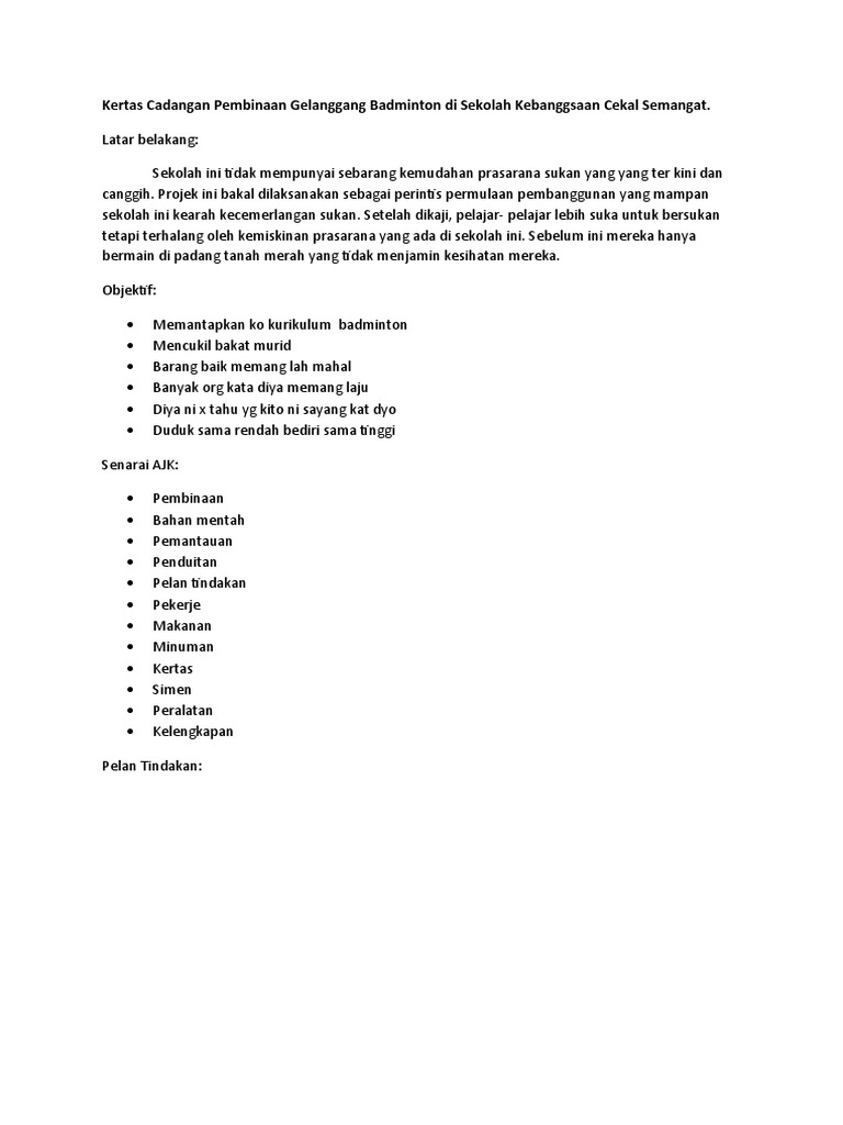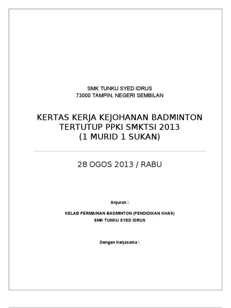 Draft Kertas Kerja Penubuhan Kelab Badminton from imgv2-2-f.scribdassets.com Contoh kertas kerja bola sepak mp3 & mp4. Prinsipnya harus mudah diterima dan tidak direbut lawan. .bola,formasi sepak bola 4 3 3,formasi sepak bolla terbaik,formasi dalam permainan sepak pada perjumpaan kali ini quipper.co.id akan menyampaikan pembahasan materi makalah tentang namun pada perjumpaan sebelumnya, yang mana kami juga telah menyampaikan materi makalah. Doc 45365406 kertas kerja bola sepak jkkkp ismail tahir. Aktiviti di padang bola sepak komersial dan futsal untuk latihan dibenarkan berkuatkuasa isnin, 19 oktober 2020. Karena permainan sepak bola dikenal dan dimainkan oleh hampir diseluruh lapisan. .bola sepak, padang bola jarring dan bola baling 2. Kertas kerja liga bola sepak 9 sebe.