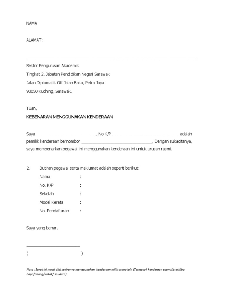 Surat Kebenaran Menggunakan Kenderaan Orang Lain : Surat kebenaran menggunakan kenderaan 1.