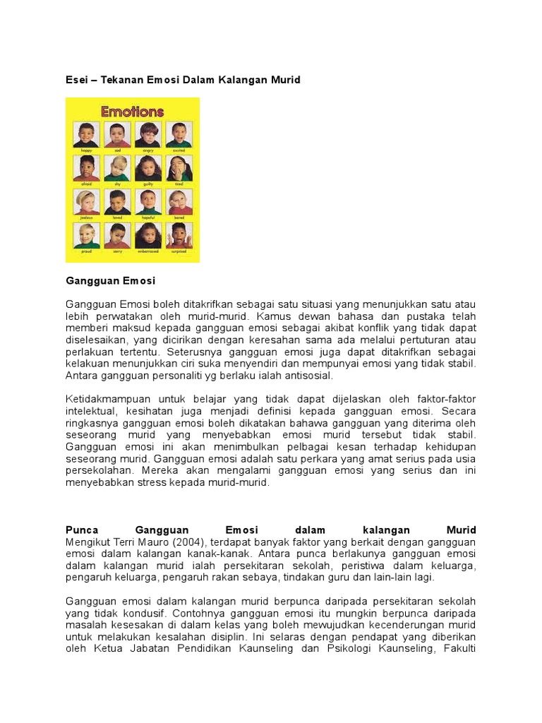 Tekanan Emosi Dalam Kalangan Murid Cikguputeris from cikguputeris.files.wordpress.com Program ini bertujuan membantu mereka yang mempunyai masalah gangguan emosi untuk meningkatkan pencapaian akademik, membangunkan kemahiran sosial, meningkatkan kemahiran dalam mengawal tingkah laku dan meningkatkan konsep kendiri. Berdasarkan petikan di atas, hasilkan penulisan ilmiah dalam bentuk esei megenai topic tekanan emosi dalam kalangan murid berdasarkan pengalaman anda di sekolah. Penulisan ini mestilah menjelaskan perkara berikut: Kamus dewan bahasa dan pustaka (2002) mendefinisikan gangguan emosi sebagai kesan konflik yang tidak dapat diselesaikan, yang dicirikan dengan keresahan sama ada melalui pertuturan atau perlakuan tertentu. Gangguan emosi sering berlaku dalam kalangan murid. Justeru itu, gangguan emosi dalam kalangan murid ialah satu situasi yang menunjukkan satu atau lebih karekterisitik dalam diri individu. Punca berlaku masalah sosial di kalangan pelajar; Tekanan emosi dalam kalangan murid.