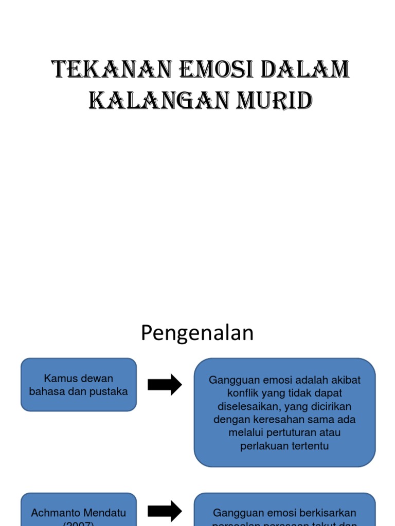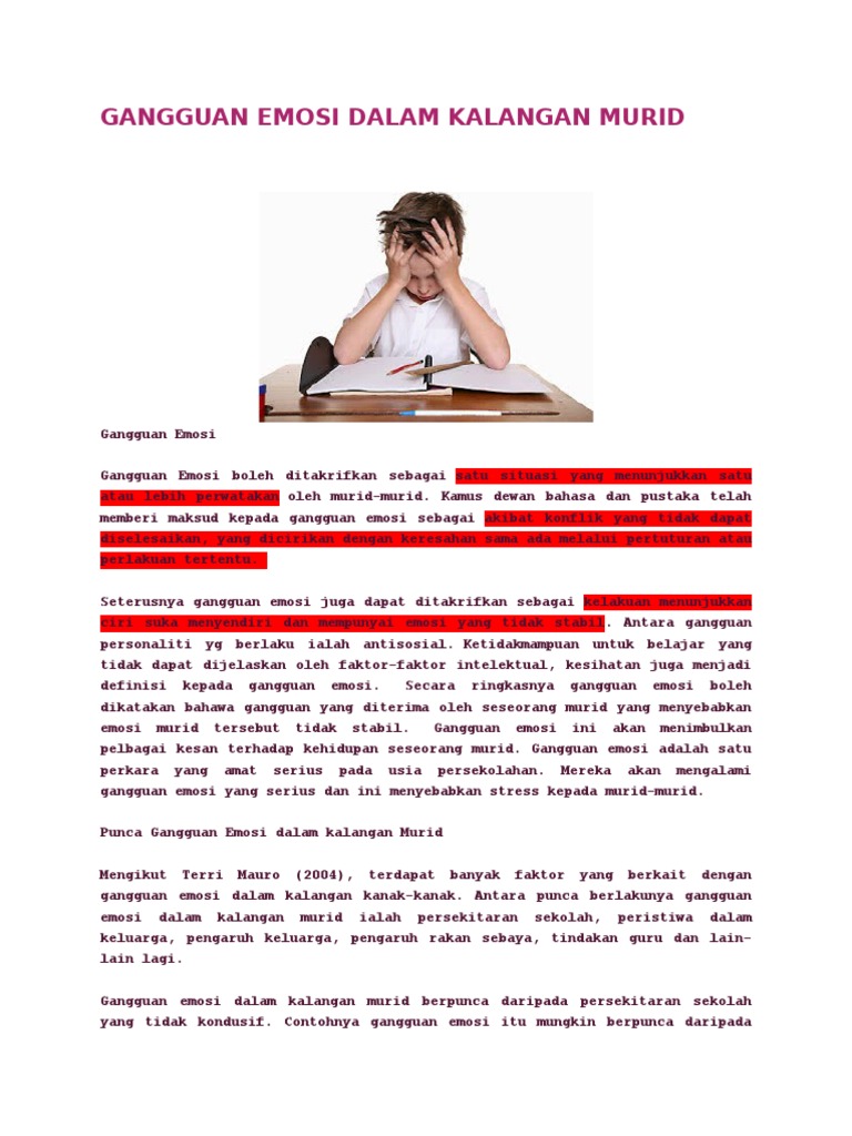 Tekanan Emosi Dalam Kalangan Murid from imgv2-1-f.scribdassets.com Karena pada hakikatnya tidak ada emosi yang positif dan positif, tergantung persepsi individu yang terkait dan akibat yang akan dialaminya ada beberapa alasan orang mengalami gangguan… Walau apa pun puncanya, ia berkaitan dengan masalah emosi atau gangguan terhadap kesihatan mental individu terbabit. Punca berlaku masalah sosial di kalangan pelajar; Tan sri lee lam thye ialah ahli majlis penasihat promosi kesihatan mental. Gangguan emosi adalah satu perkara yang amat serius pada usia persekolahan. Justeru itu, gangguan emosi dalam kalangan murid ialah satu situasi yang menunjukkan satu atau lebih karekterisitik dalam diri individu. Hal ini penting terutamanya kerana kehidupan murid pada masa kini adalah penentu kehidupan mereka di masa akan datang. Gangguan emosi ini dapat dikategorikan dalam tiga jenis iaitu gangguan emosi ringan, gangguan emosi sederhana dan gangguan emosi berat.
